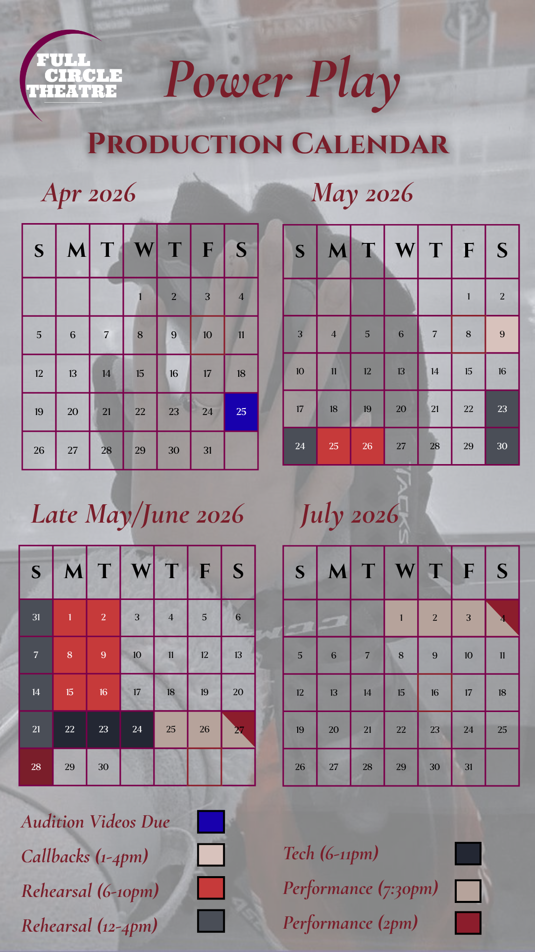 Rehearsal Schedule: Mon & Tues evenings, Sat & Sun afternoons. Rehearsals to start the week of May 23, 2026.